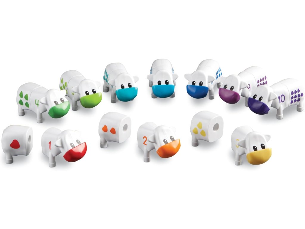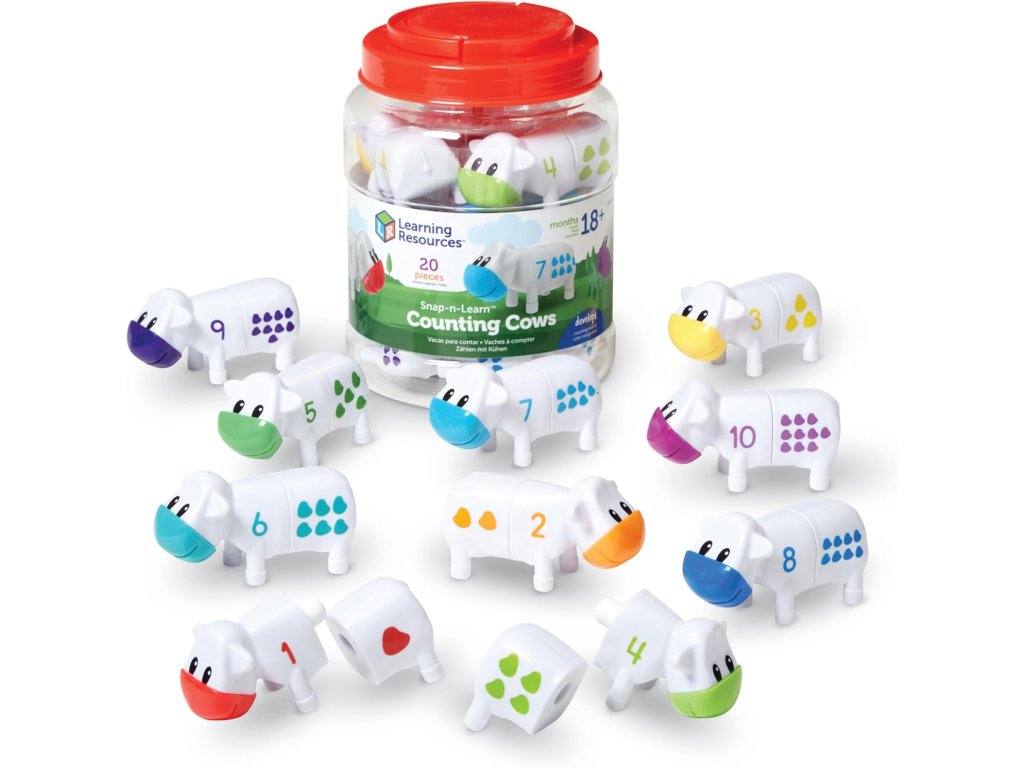 Snap-n-Learn™ Počítání kravičky od značky Learning Resources je vzdělávací hračka, která pomáhá dětem zábavnou formou osvojit si první matematické dovednosti. Každá kravička je rozdělena na dvě části – na přední je číslo, na zadní odpovídající počet teček. Úkolem dítěte je najít správné spojení a složit celou kravičku.