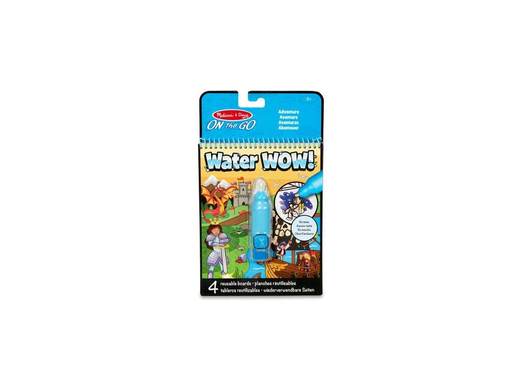Kouzlení vodou Dobrodružství - Čisté malování! Tyto "vodní" omalovánky obsahují čtyři znovupoužitelné stránky a znovuplnitelné vodní pero. Použijte vodní pero, jehož tahy se zobrazí živé barvy na jednotlivých obrázcích. Potom nechte stránku usušit a obrázek opět zmizí a znovu po navlhčení objeví. Vodní pero se snadno drží a vkládá se do úložné schránky na přední straně omalovánky, což činí Water WOW pratickou omalovánkou i pro cestování.