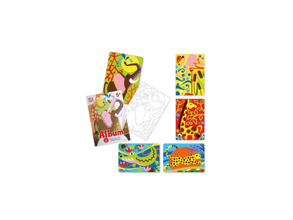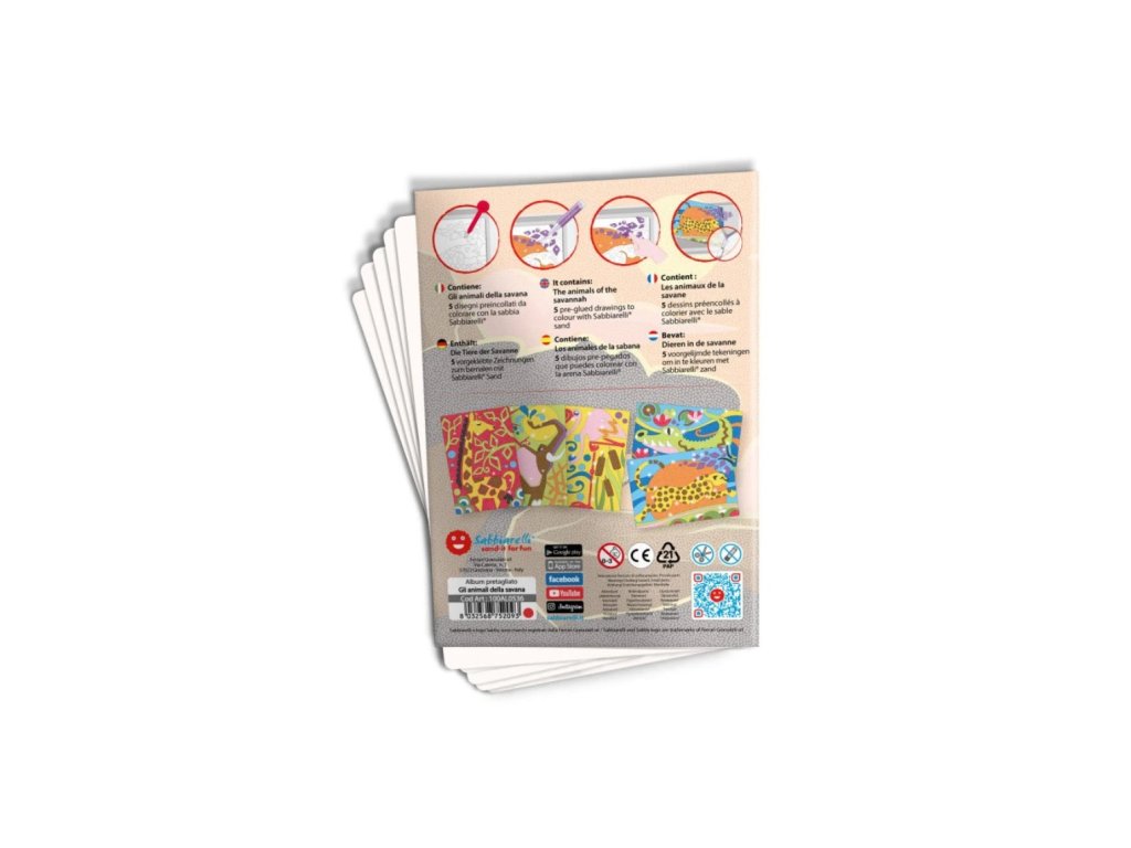 Album obsahuje 5 kreseb (15x20cm) předřezaných na lepicím papíře s vyobrazením zvířat ze savany, připravených k vybarvení pískem. Nejsou potřeba žádné nůžky ani lepidlo: odstraněním papíru z výkresu zbývá lepicí povrch obarvit pískem Sabbiarelli® (písek není součástí balení).