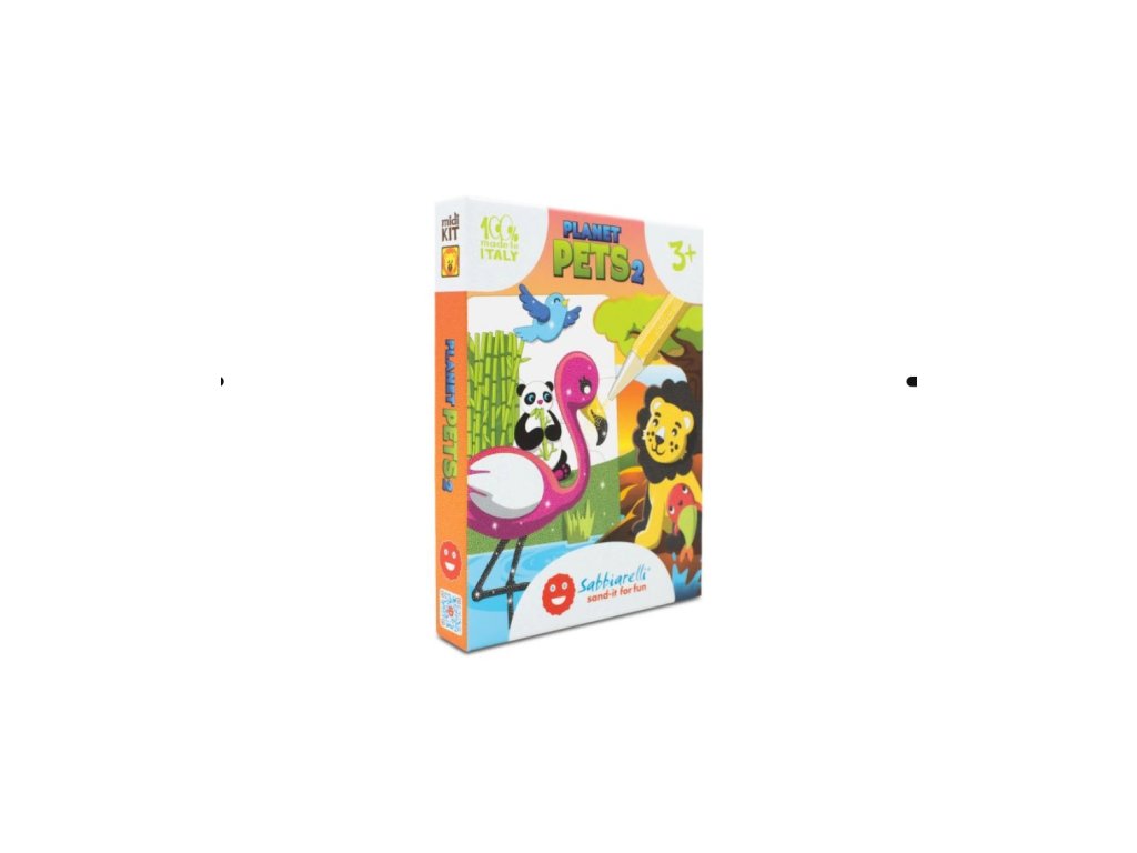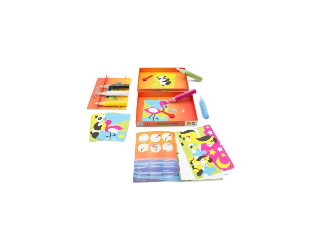 Sada obsahuje 6 doplňovatelných pískových per, 2 škrabky, 8 předřezaných kreseb k pískování pro hraní ve dvojicích. Zastoupeni jsou: Plameňáci - Lvi - Pandy - Ryby - Poníci.