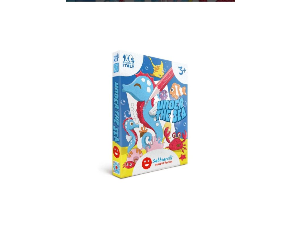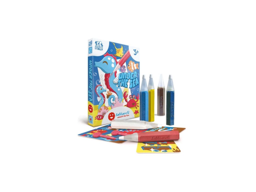 Sada obsahuje 6 doplňovatelných pískových per, 2 škrabky a 10 kreseb k vybarvení přirozeně třpytivým pískem Sabbiarelli. Kresby se po dokončení stanou dílky skládačky a poskládají dohromady krásný obrázek věnovaný rybám žijícím na mořském dně. Nejsou potřeba žádné nůžky ani lepidlo: odstraněním papíru z archů zbývá lepicí plochu obarvit písky Sabbiarelli.