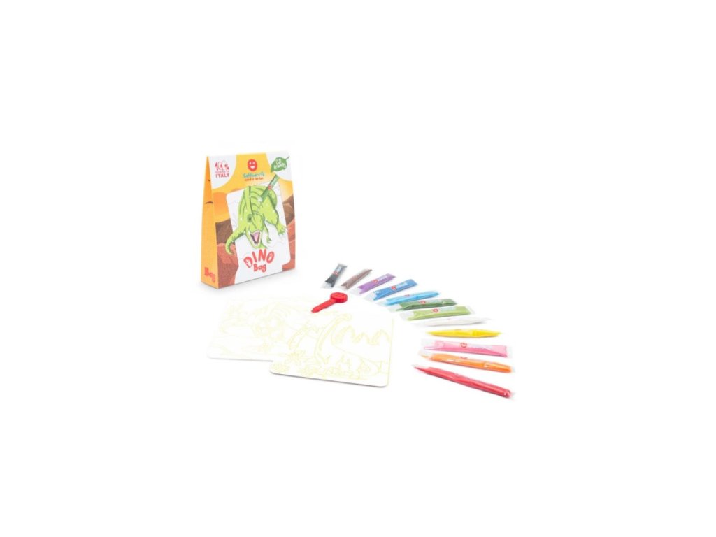 Sáček na písek" obsahuje 2 výkresy s motivem Dinosaurů, škrabku a 12 sáčků se šumivým mramorovým pískem , obarvených netoxickými a ekologickými barvami na vodní bázi. Tato sada ve tvaru mini sáčku představuje dokonalé řešení pro ty, kteří se chtějí dozvědět o hře malování pískem a vyzkoušet si ji, než si koupí sadu s pery . Chcete-li vytvořit herní základ, doporučujeme obnovit víko krabice od bot nebo dokonce jen list papíru A4. Umístěním jedné ze dvou kreseb na tuto herní základnu vám škrabka pomůže odstranit kousky kresby, které chcete vybarvit stejnou barvou. V tomto okamžiku otevřete sáček požadované barvy a nasypte jej na lepicí části designu, poté písek zafixujte prsty a setřeste přebytečný písek, který lze shromáždit ve sklenici. A takto postupujeme po jedné barvě, dokud není vybarvený celý výkres. Nakonec získáte dva třpytivé obrázky dinosaurů, připravené k zavěšení nebo darování jako karty.